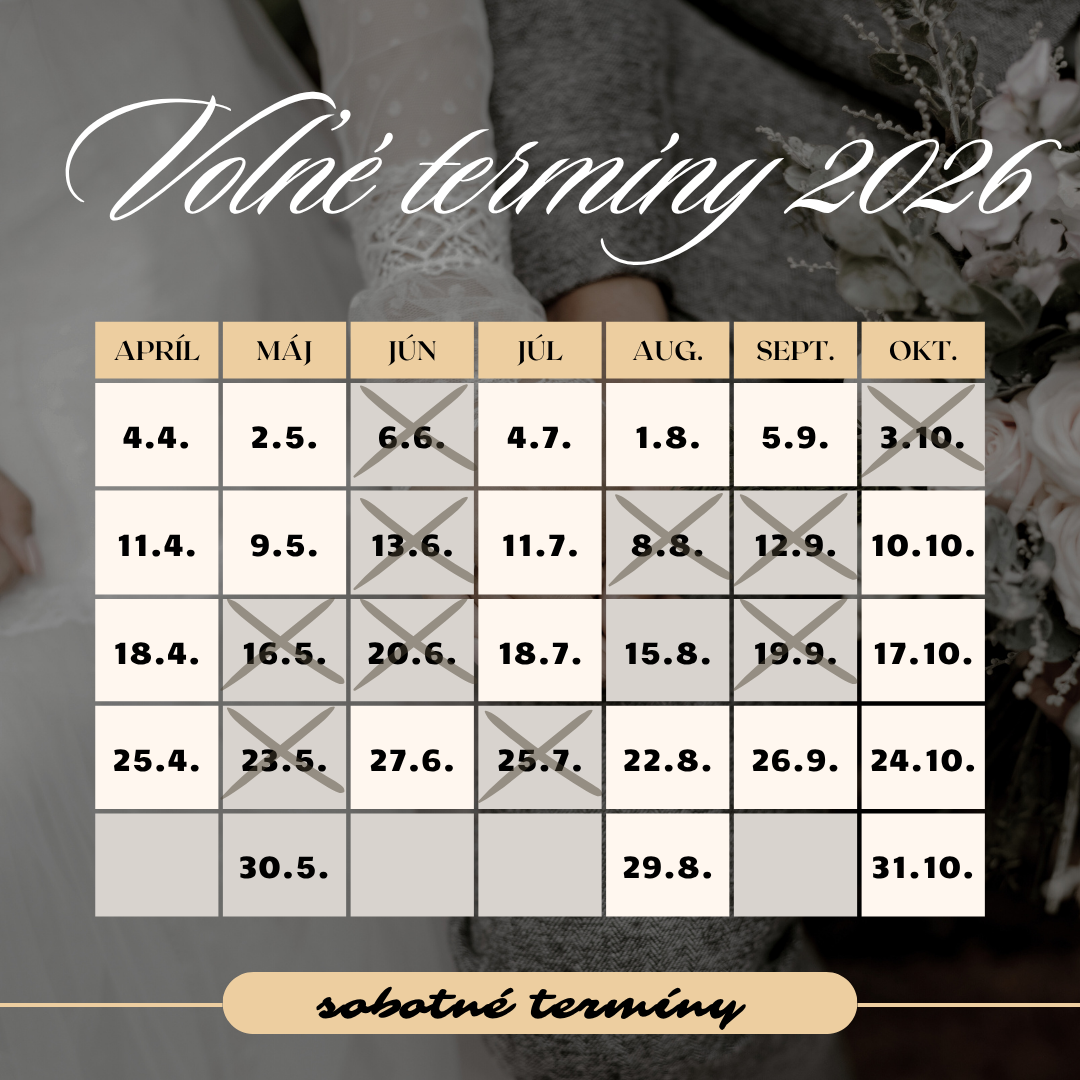 Aktuálne voľné sobotné termíny, ktoré mám k dispozícii, nájdete v tejto tabuľke. Ak mám Váš termín ešte voľný, informujte sa ohľadom jeho rezervovania prostredníctvom rezervačného formulára nižšie v sekcii " Pýtajte sa". Termíny sa pravidelne zapĺňajú, častokrát píše na rovnaký termín viacero neviest, preto netreba s rezerváciou dlho váhať :)