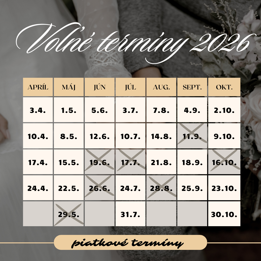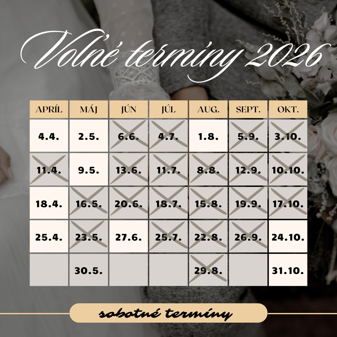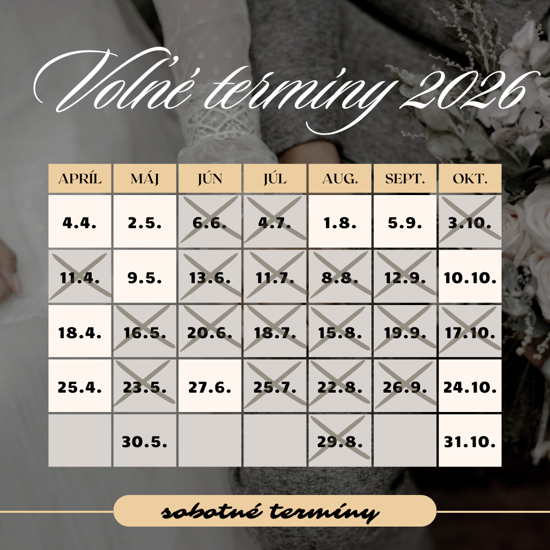 Aktuálne voľné sobotné termíny, ktoré mám k dispozícii, nájdete v tejto tabuľke. Ak mám Váš termín ešte voľný, informujte sa ohľadom jeho rezervovania prostredníctvom rezervačného formulára nižšie v sekcii " Pýtajte sa". Termíny sa pravidelne zapĺňajú, častokrát píše na rovnaký termín viacero neviest, preto netreba s rezerváciou dlho váhať :)